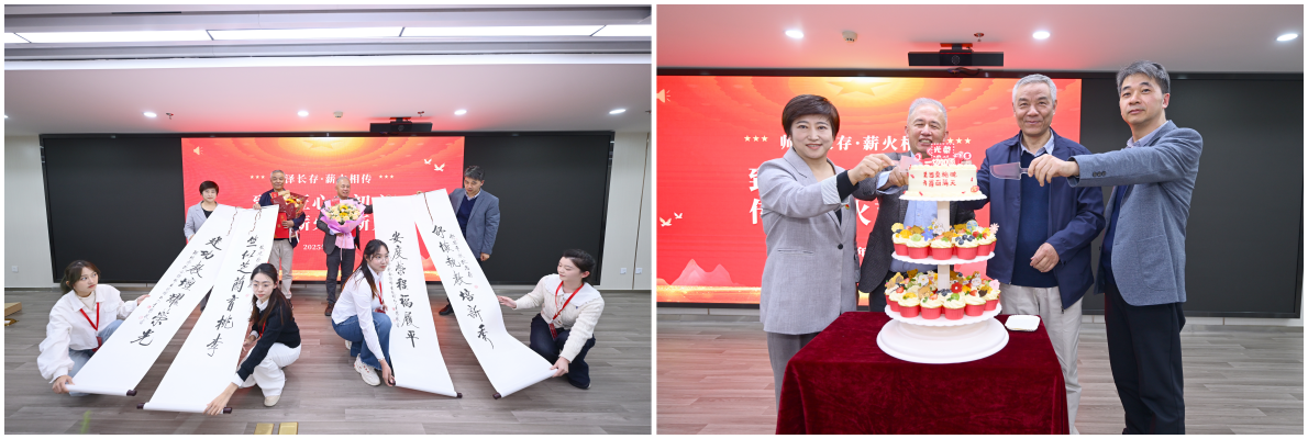 接下来的致敬环节由党委副书记张珺主持。学生代表首先上台,向竺建荣老师、舒安平老师献上象征感恩与祝福的花束。紧接着,学院党委书记徐琳瑜与院长沈珍瑶共同为两位老师颁发荣退证书,并送上学院定制的书法卷轴。卷轴上题写着承载美好祝福的荣退寄语-“竺似芝兰育桃李,建功教坛耀荣光”与“舒怀执教培新秀,安度荣程福履平”。这份心意既饱含对两位老师教育生涯的崇敬,也寄托了对他们退休生活的美好祝愿。随后,两位领导与两位荣退老师共同切开象征圆满与祝福的蛋糕。仪式尾声,全体与会人员合影留念,定格下这一温暖瞬间,荣退仪式圆满落幕。