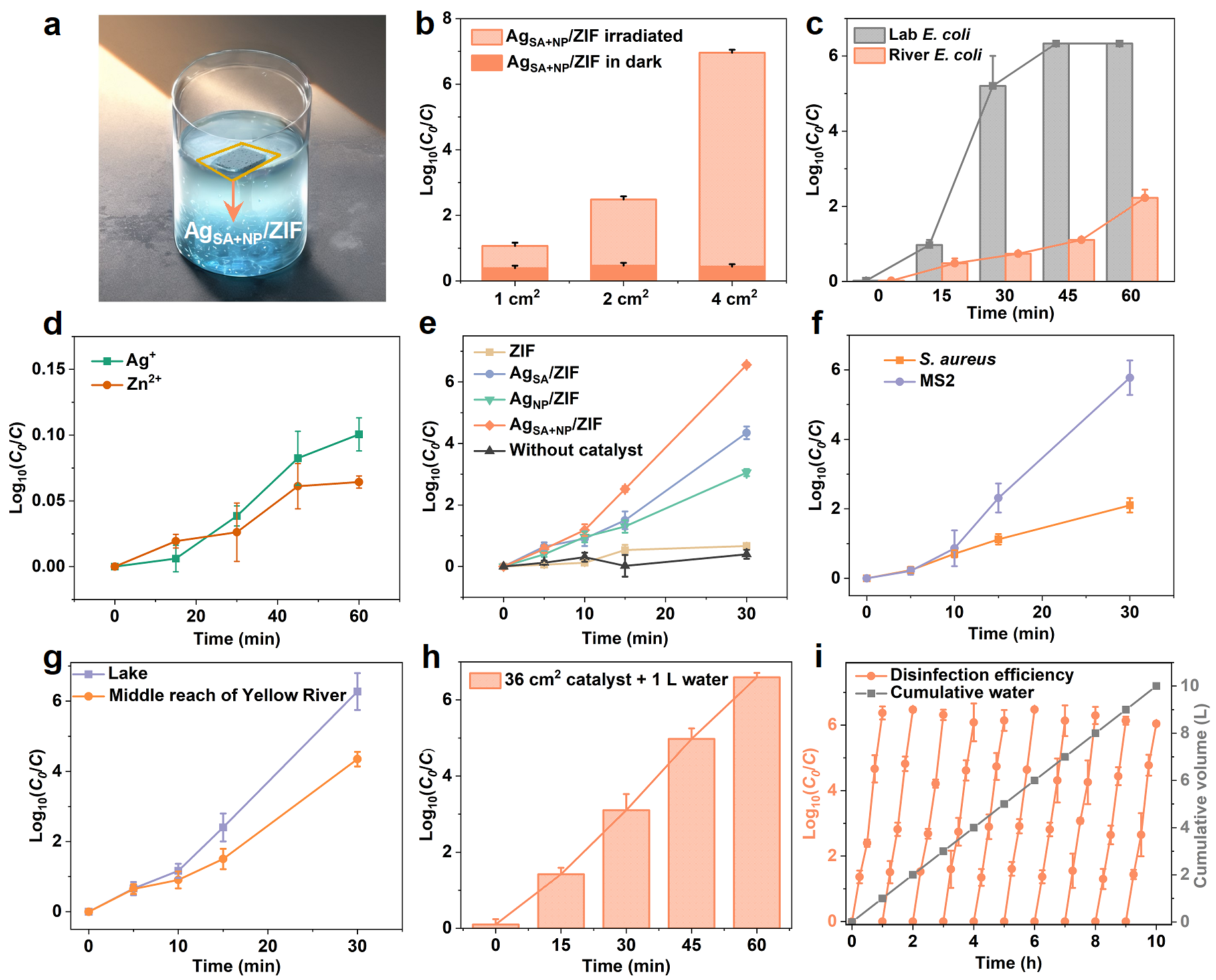 在消毒性能方面,发现4.0 cm²的AgSA+NP/ZIF在30分钟内可实现对贫营养地表水中具有压力抗性的大肠杆菌(E. coli)超过6.0 log(99.9999%)的灭活。AgSA+NP/ZIF的杀菌效率分别是AgSA/ZIF (只负载银单原子) 和AgNP/ZIF (仅负载银纳米颗粒) 的195倍和2630倍以上。进一步测试显示,36 cm²的催化剂能够消毒至少10.0 L水量,满足世界卫生组织 (WHO) 推荐的人均每日饮用水量标准 (8.0 L)。这一成果展示了该催化剂在实际应用中的高效性和稳定性,特别是在偏远地区的水消毒中具有巨大潜力。