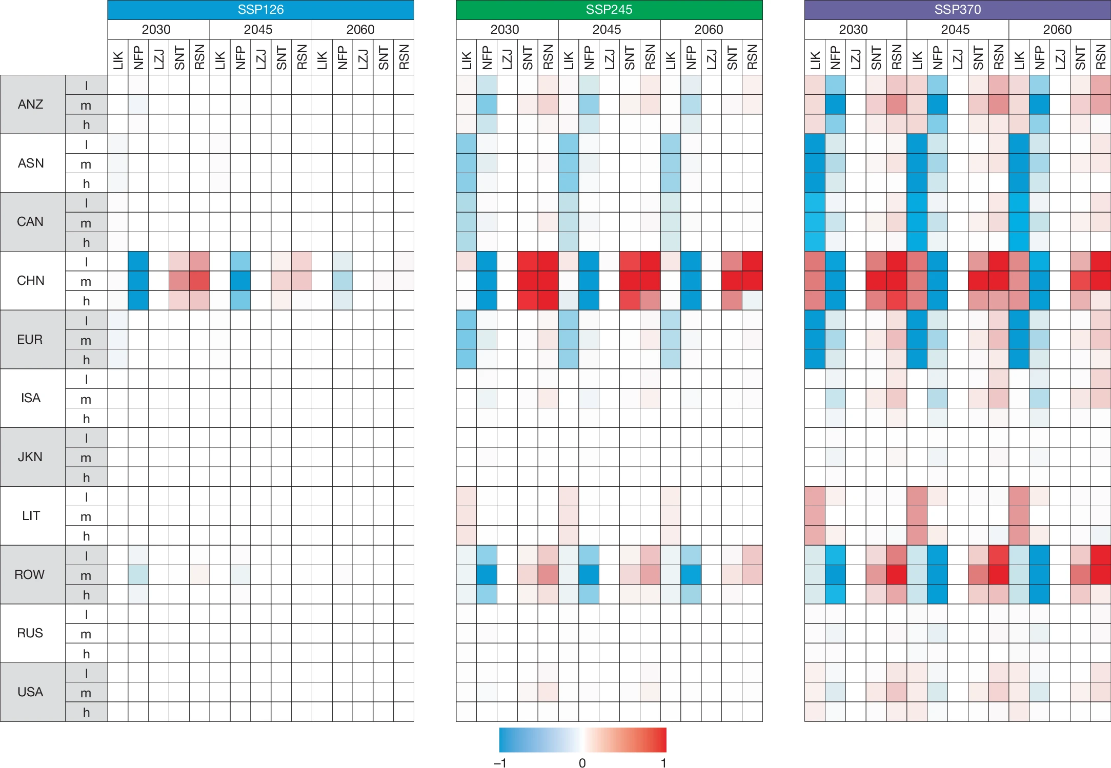 图4:四种区域合作方案下的排放强度变化(2030-2060年)