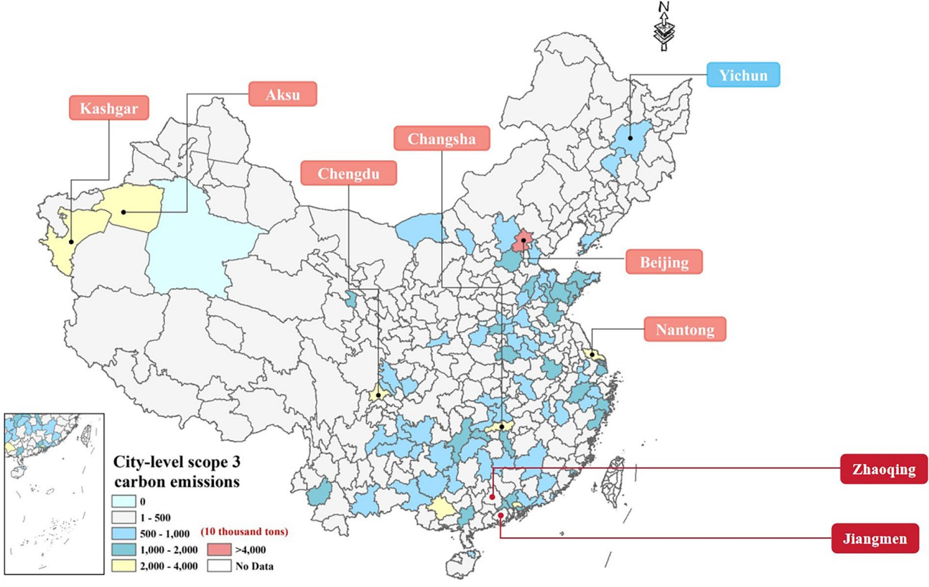 Scope 3排放量介于1–6,841万吨CO2之间,呈现出显著的空间差异性。北京市Scope 3排放最高,黑龙江省伊春市最低。总体来看,中部与东部沿海地区的城市排放水平普遍较高,代表性城市包括北京、南通、成都和长沙;新疆喀什地区与阿克苏地区亦处于较高值区间。相比之下,东北地区、内蒙古自治区及西部部分地区Scope 3排放整体偏低,体现出不同发展阶段城市在消费驱动与供应链关联排放方面的明显差异。