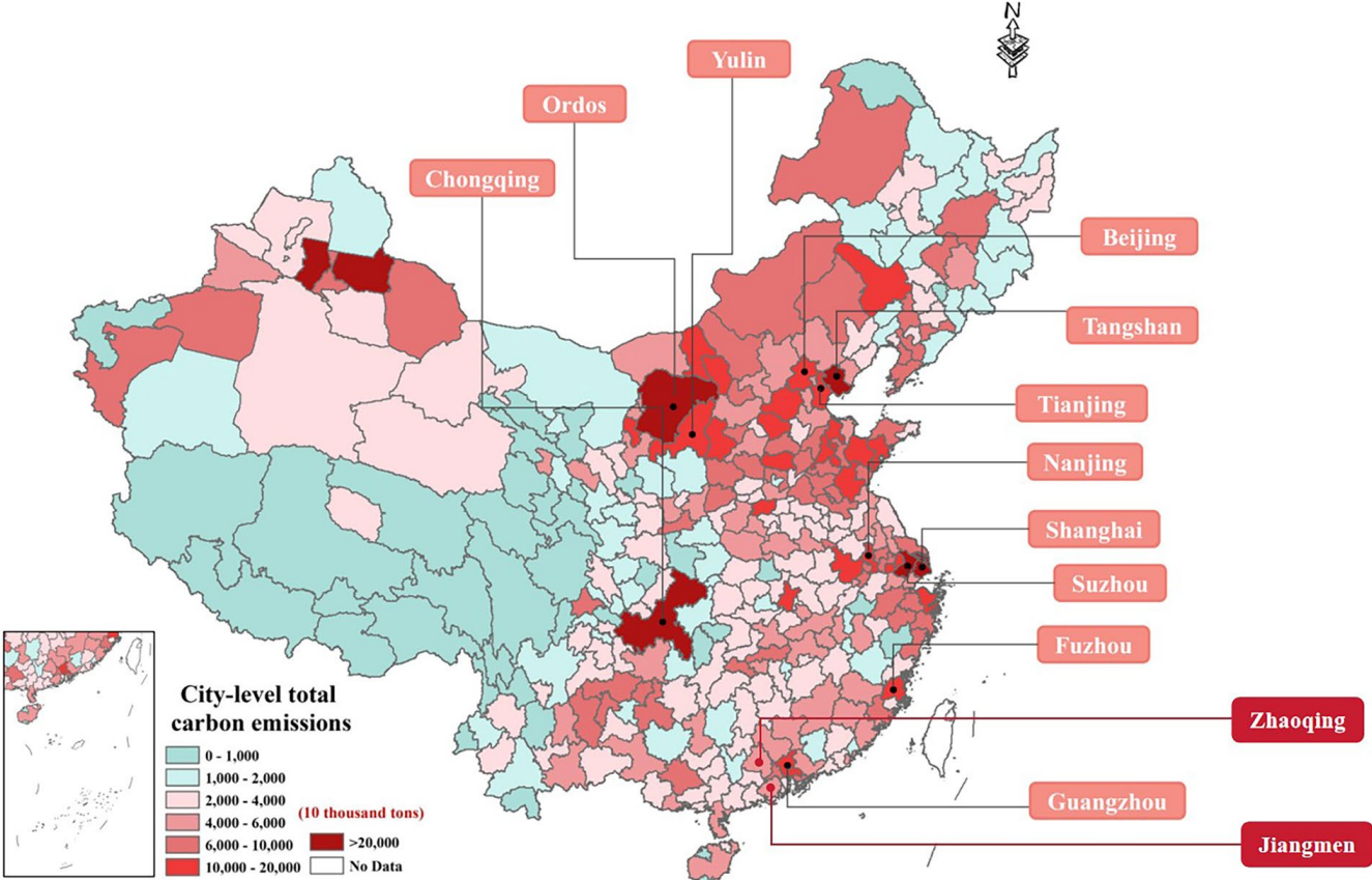 中国城市级全范围碳排放量如上,西南地区碳排放总量普遍小于1000万吨,而华北和东部沿海地区城市的碳排放总量超过4000万吨,广东、南京、福州等省会城市的碳排放总量则超过1亿吨,其苏州、唐山、鄂尔多斯和榆林的碳排放总量均达到2亿吨。其中,唐山的碳排放总量接近3亿吨。北京、天津、上海、重庆等直辖市的碳排放总量均超过1.5亿吨。
