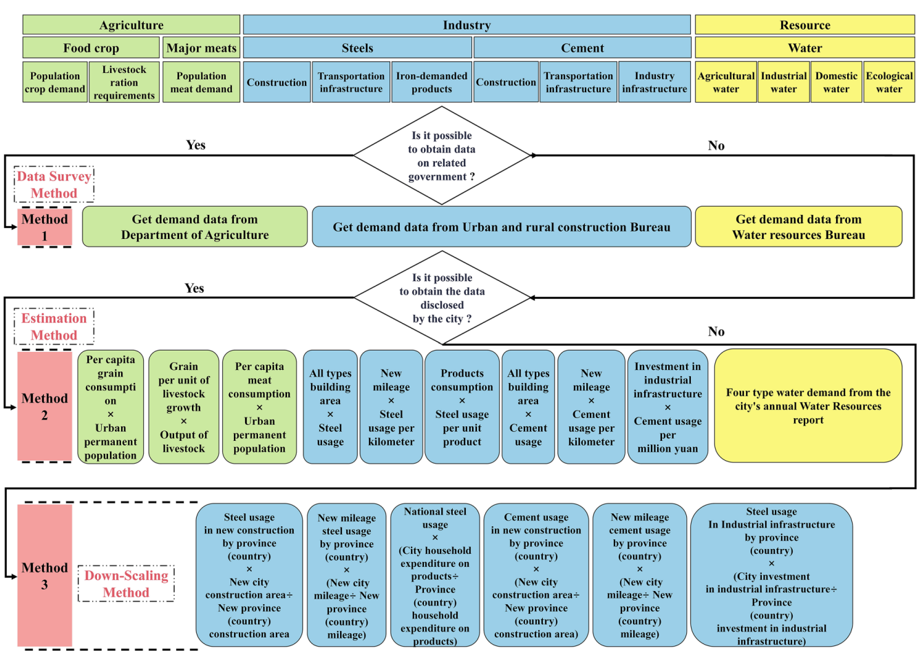 Method 3(降尺度估算):若未能获取城市层面的政府公开数据,则优先采用省级层面的政府公开数据(如省级统计年鉴),基于人口比例降尺度分配到城市层面。若省级数据不可取,则采用国家级数据。