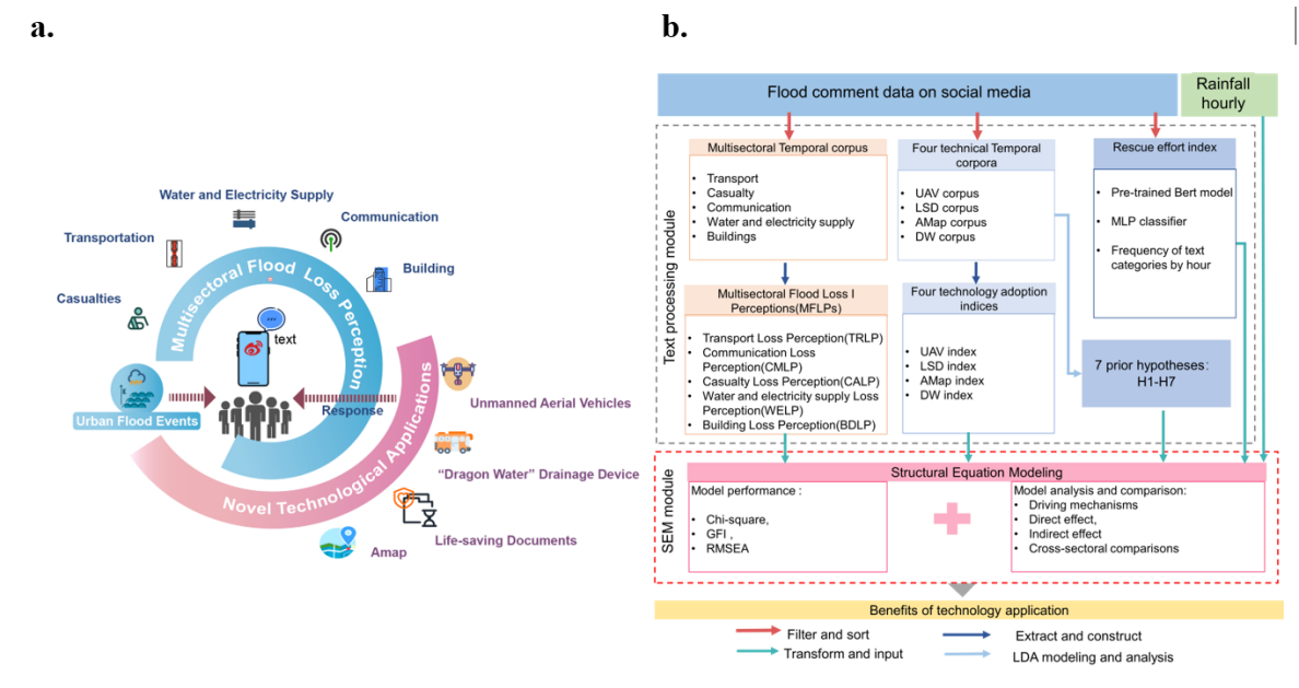 图1 研究框架图 a.洪水损失感知在灾后响应中的新技术应用示意图 b.TSEM框架概述图