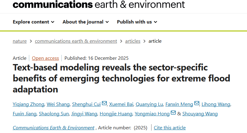 论文引用格式:Zhong, Y., Shang, W., Cui, S. et al. Text-based modeling reveals the sector-specific benefits of emerging technologies for extreme flood adaptation. Commun Earth Environ (2025). https://doi.org/10.1038/s43247-025-03077-4