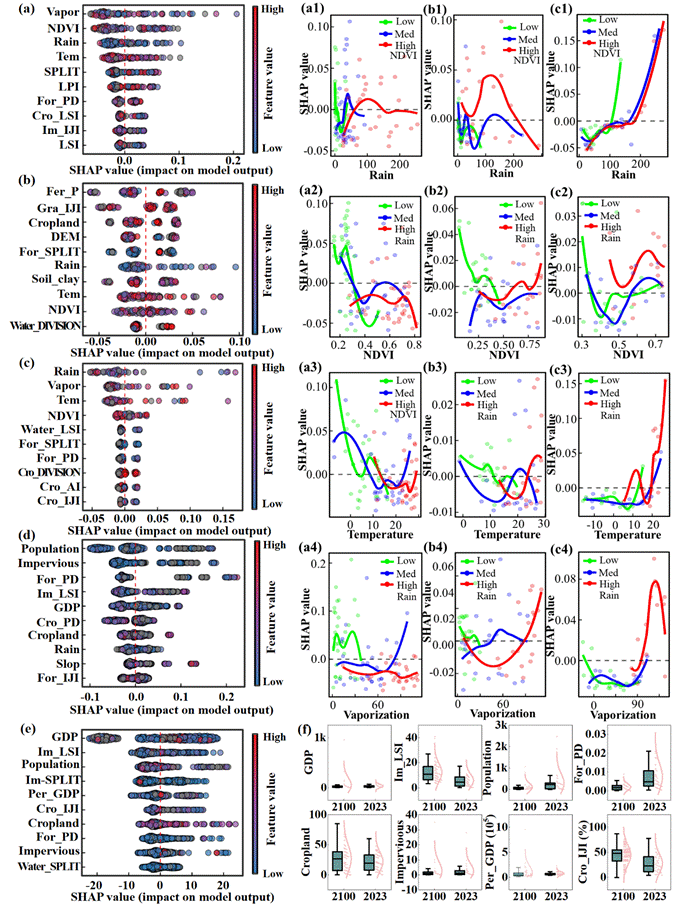 图3 营养污染时空演化的驱动机制。a-d:分别是四个PFZs营养污染的主要驱动因素。a1-c4:三个热点PFZs中关键驱动因素的相互作用效应。e:导致寒冷地区污染加剧的主要驱动因素。f: 2023年和2100年冷点关键驱动因素的统计数据。