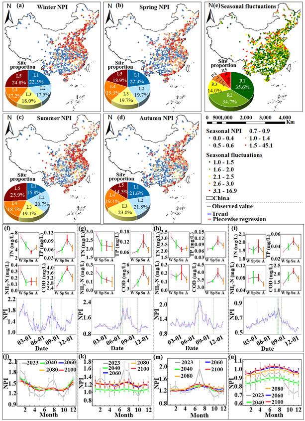 图1 营养污染的年际时间变化和未来演变。a-e:基于监测站点的季节性NPI和相关波动。f-i:根据日NPI值和特定污染物识别的四种变化类型。j-n:2040-2100年四种变异类型下的月度NPI预测。
