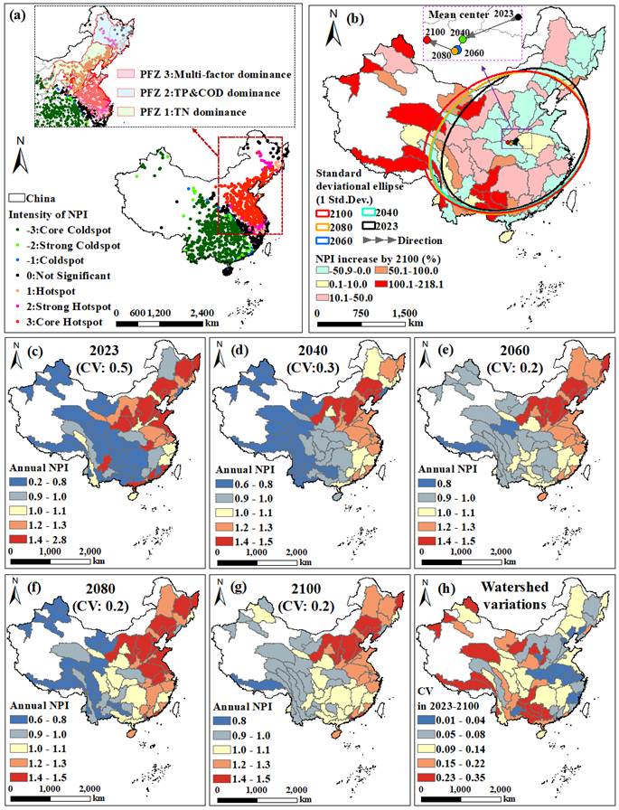 图2 营养污染的空间格局和未来演变。a:营养污染的空间热点分析和聚类模式。b:2023年至2100年污染中心的空间轨迹。c-g:2023年至2100年年度NPI的空间分布。h:2023年至2100年,基于变异系数(CV)的NPI的空间演化程度。