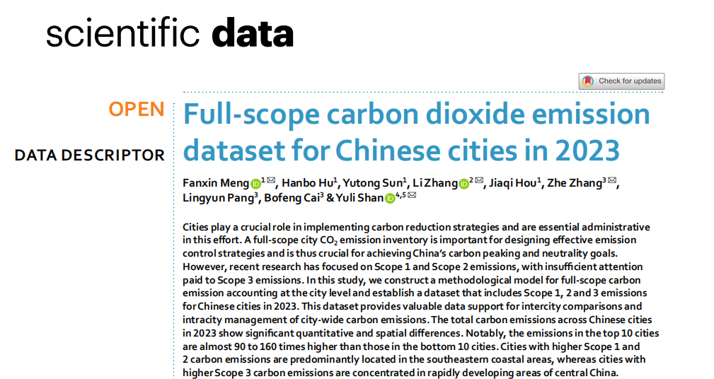 必威betway西汉姆联副教授孟凡鑫在Nature旗下期刊《Scientific data》发文共享2023年中国城市级全范围碳排放数据