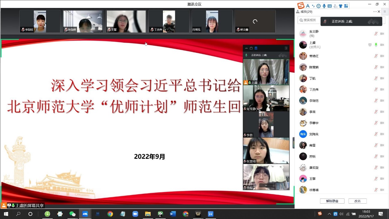 中共中央总书记、国家主席、中央军委主席习近平9月7日给我校“优师计划”师范生回信。信中,总书记表达了对同学们的殷切希望,并在北师大建校120周年和第三十八个教师节来临之际,向我校师生员工、广大校友表示祝贺和问候,向全国广大教师致以节日的祝福。必威betway西汉姆联各班及各党支部第一时间组织学习总书记回信中的精神思想,认真领会,抒发感悟。