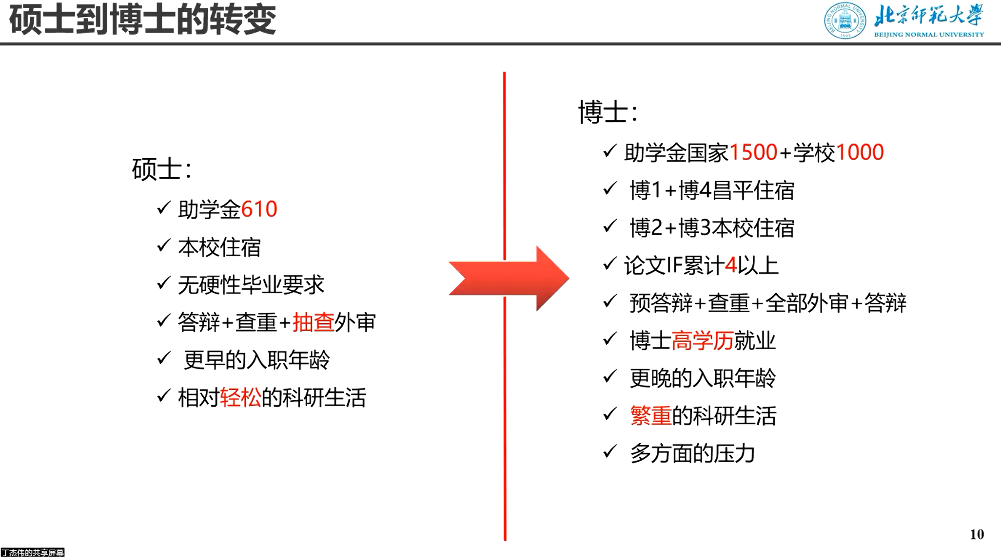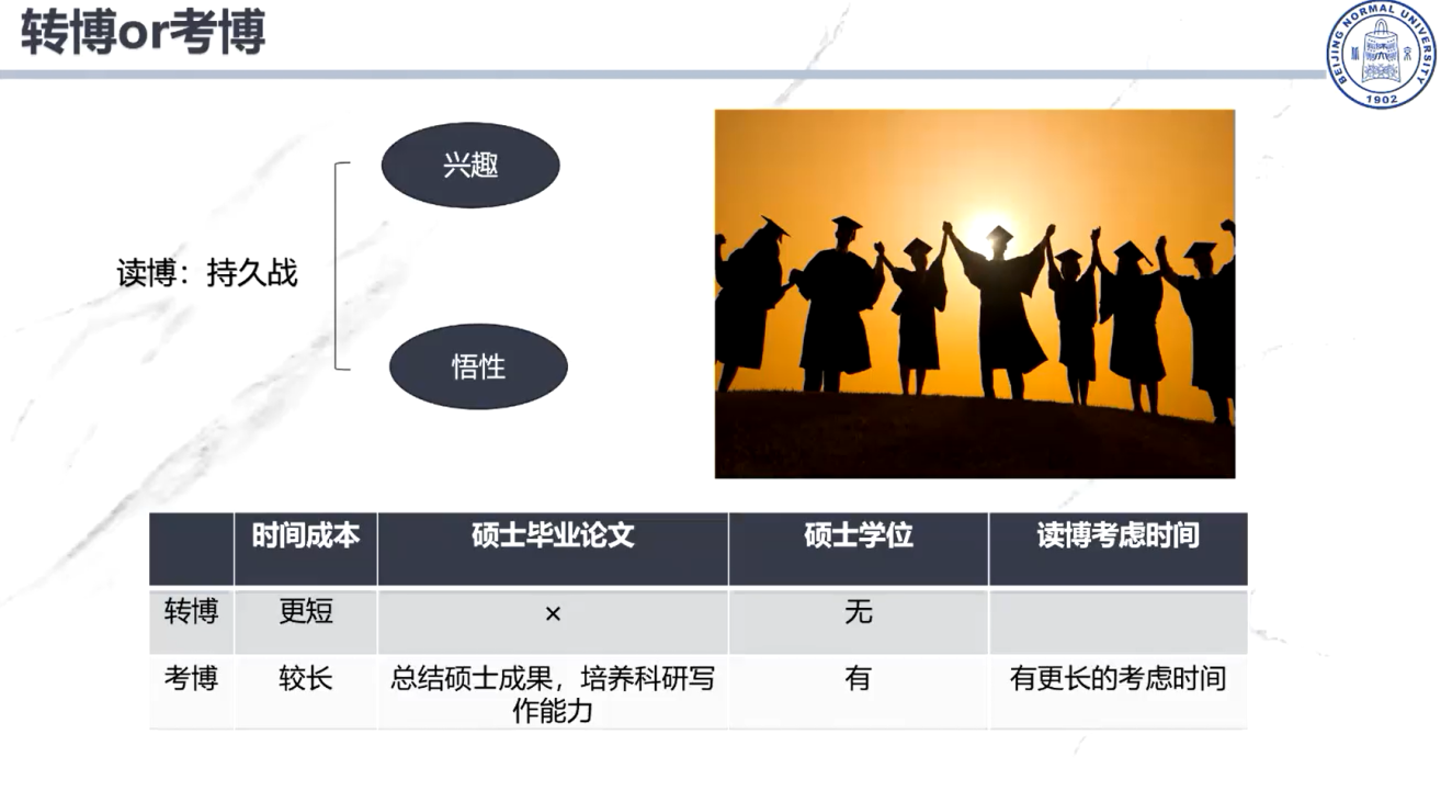师兄提到了硕士到博士的转变中,要承担更多的时间成本和更少的选择。结合自身经验,师兄告诉我们尽快明确自己的职业规划,不要盲目跟风,找到适合自己的道路,不惧挫折,不断激励自己去达成目标。
