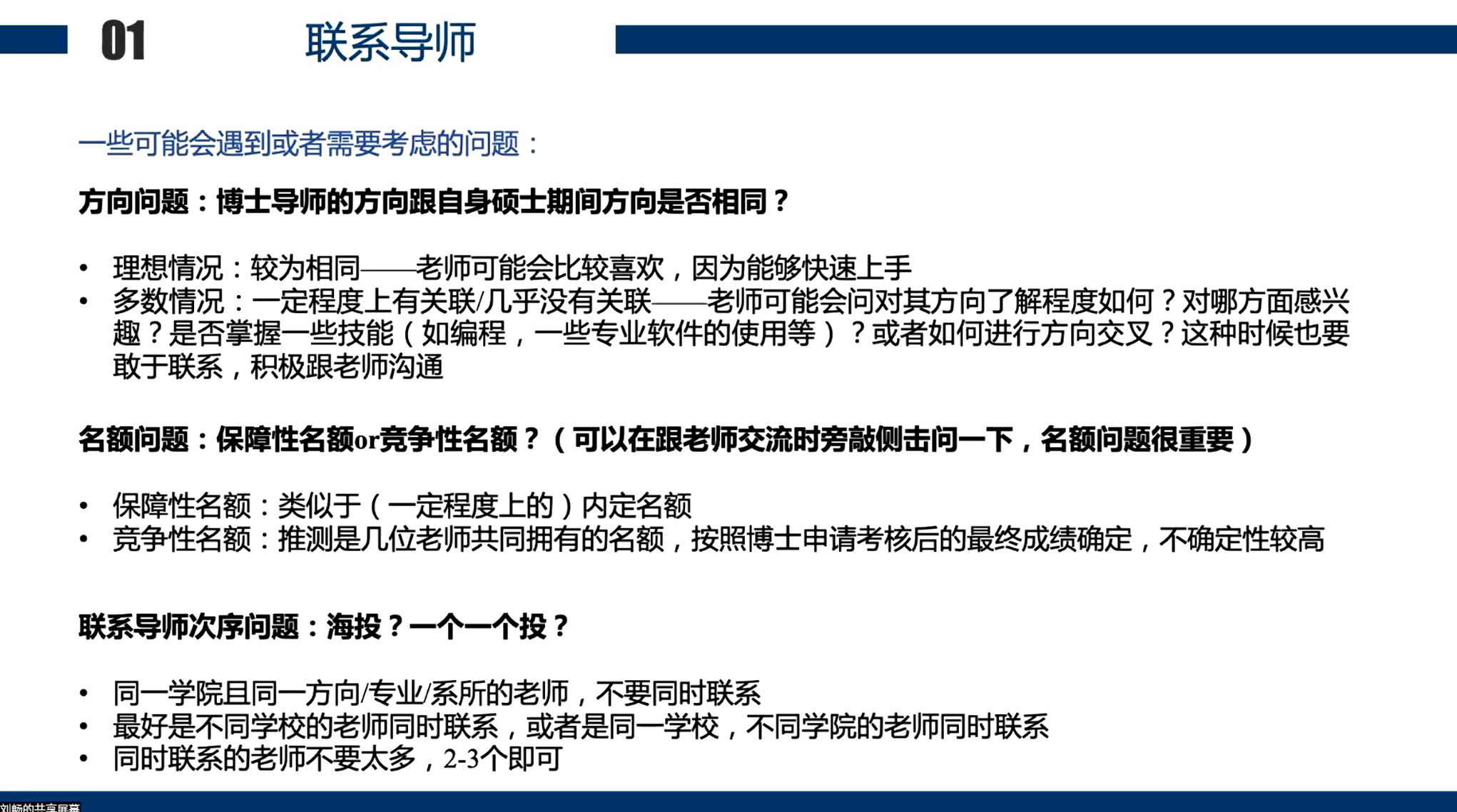 第二位给我们带来分享的是刘畅师姐,为我们介绍了外校申博的经验。申请外校时和导师联系的经验以及遇到的问题:1.多数情况下研究方向会有变动,2.其次要问清楚老师是否有名额,3.最后是建议是联系导师数量不能过少也不能过多。