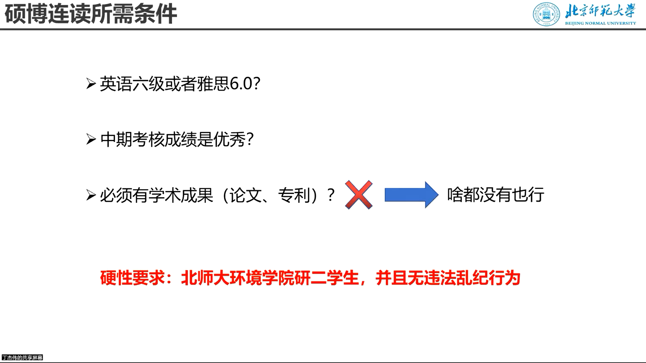 第三位给我们带来分享的是丁杰伟师兄,为我们介绍了硕博连读的申请经验。首先介绍了申请的时间节点,一般在每年的11月份。然后师兄介绍了申请条件,提到了论文或专利不是硬性条件,而英语成绩和中期考核优秀是必须条件。