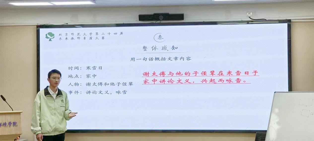 在模拟课堂中,选手在讲述知识的同时也展现出了各有千秋的个人特色,有的课堂如潺潺流水流过群山座座,安详又悠扬,有的课堂如昨夜天光乍破远山轮廓,慷慨且激昂。各位选手也展现了自身优秀的教师品质,如清晰的言语表达,流畅的逻辑推演,细致的知识梳理。在这些生动有趣的课堂上,恍惚间有那么一瞬,我们还是懵懂的中学生。