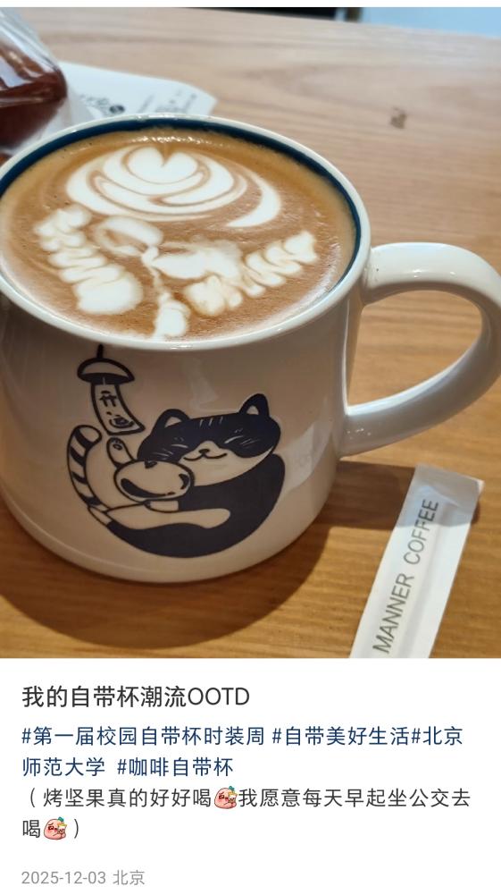 线下层面,活动联动星巴克(北师大店)、霸王茶姬(枫蓝国际店)等多家支持 “自带杯” 的商家,推出消费立减优惠。同学们携自带杯到店消费,既能享受实惠,又能参与打卡抽奖,在日常消费场景中践行环保。