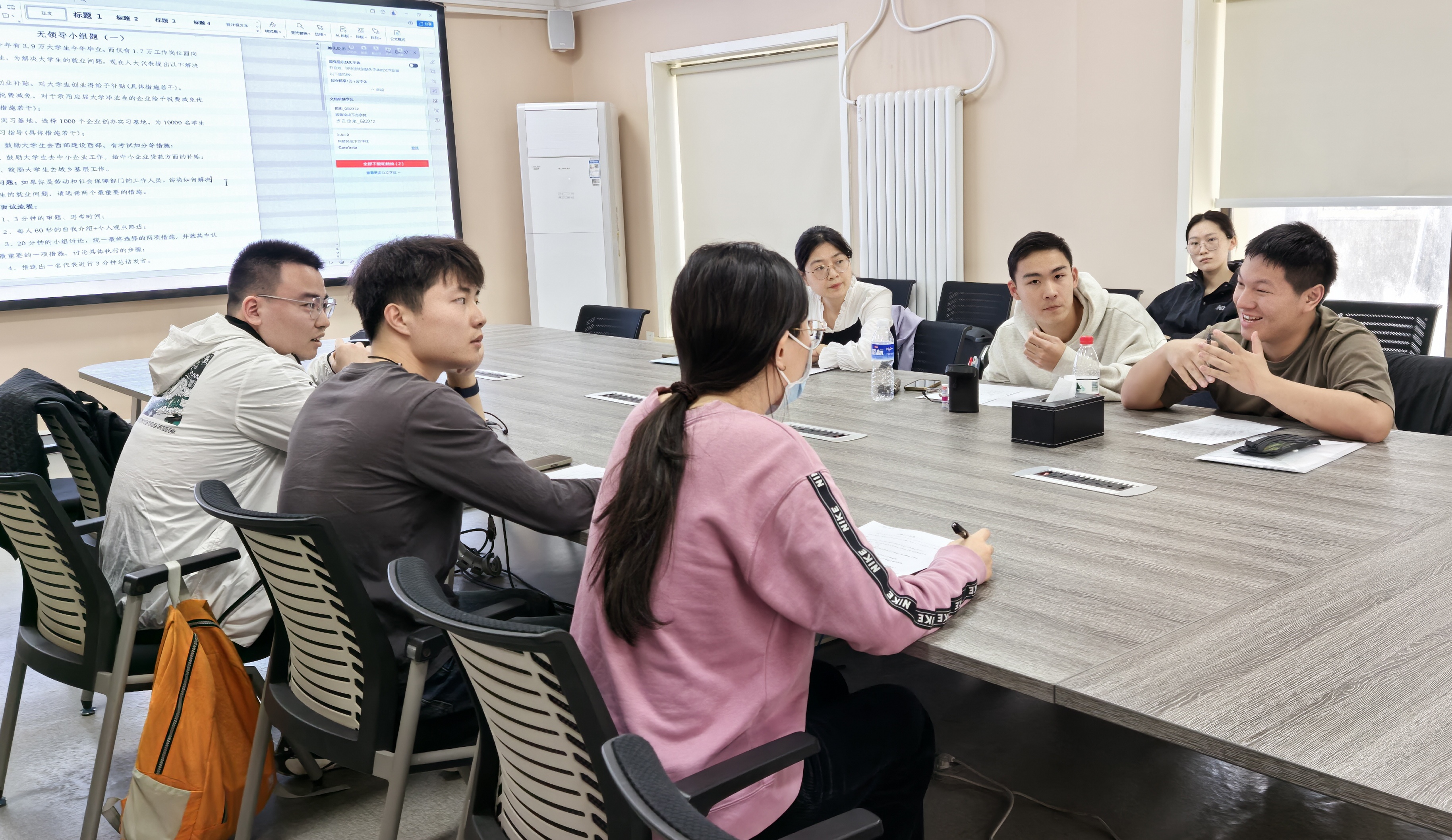 中场休息后,第二组同学对于另一道关于“年轻人是否应该内卷”的问题展开了无领导小组讨论,吸取了上一组的经验后,这六名同学的讨论流程更加明晰,时间把控更加到位。樊老师在认可之后,也提出了改进建议,“内卷”的意义和内涵应该界定清楚,普遍讨论的热点话题如果提出更多创新的观点会更加吸引面试官的目光。