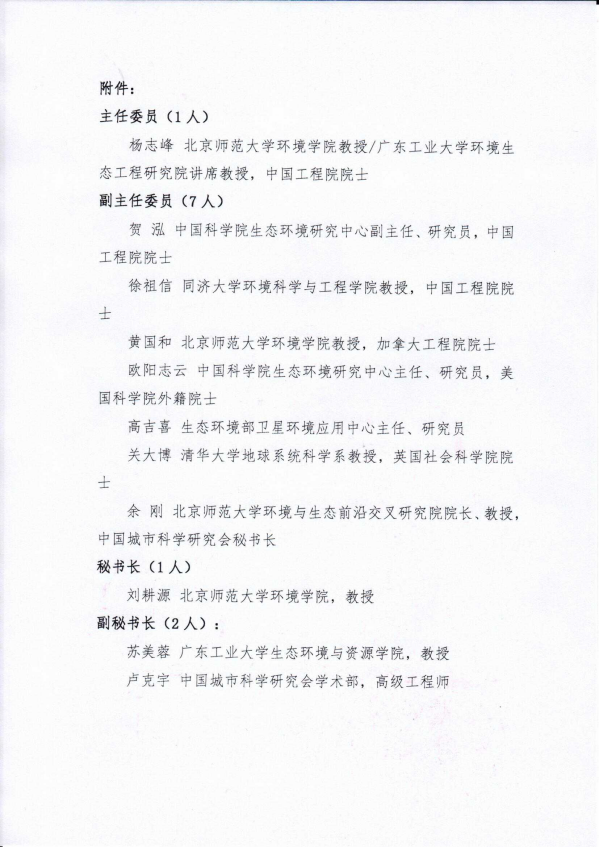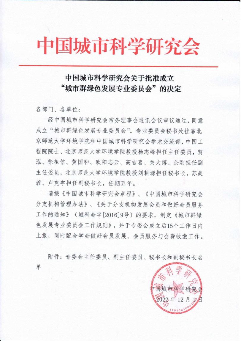 2022年12月1日,经中国城市科学研究会常务理事会通讯会议审议通过,同意成立“城市群绿色发展专业委员会”,专业委员会秘书处挂靠必威betway西汉姆联和中国城市科学研究会学术交流部,中国工程院院士、必威betway西汉姆联教授杨志峰担任主任委员,贺泓、徐祖信、黄国和、欧阳志云、高吉喜、关大博、余刚担任副主任委员,必威betway西汉姆联教授刘耕源担任秘书长,苏美蓉、卢克宇担任副秘书长。
