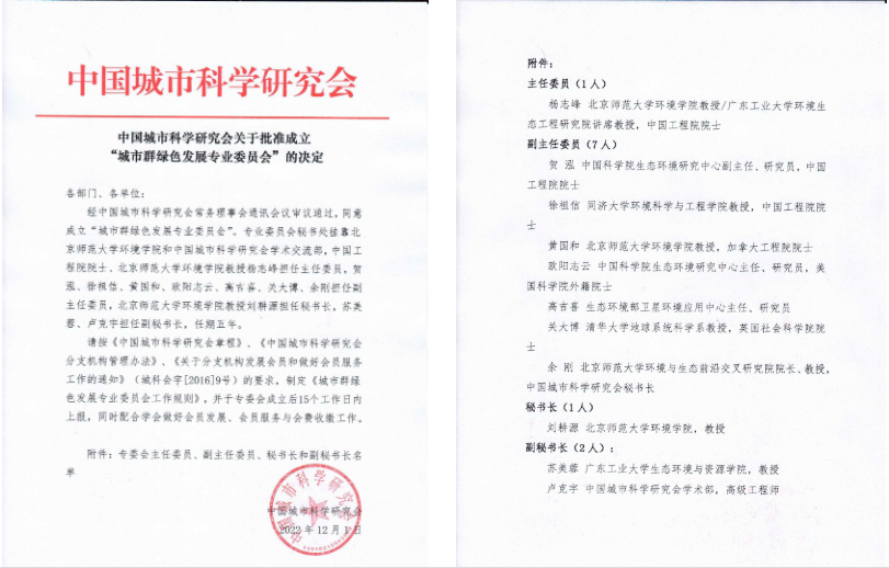 2022年12月1日,经中国城市科学研究会常务理事会通讯会议审议通过,同意成立“城市群绿色发展专业委员会”,专业委员会秘书处挂靠必威betway西汉姆联和中国城市科学研究会学术交流部,中国工程院院士、必威betway西汉姆联教授杨志峰担任主任委员,贺泓、徐祖信、黄国和、欧阳志云、高吉喜、关大博、余刚担任副主任委员,必威betway西汉姆联教授刘耕源担任秘书长,苏美蓉、卢克宇担任副秘书长。